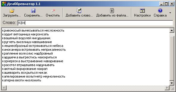 Эта программа - одна из немногих шуточных программ АтолЛ. Она выполняет шуточную расшифровку аббревиатур, причём случайным образом, беря слова из словарей. слово-аббревиатуру вы задаёте сами, и на выходе получаете нужное количество иногда очень смешных расшифровок аббревиатуры. Словари вы можете изменять и дополнять самостоятельно, а здесь вы можете скачать готовые словари. Работа с программой очень проста, полная справка - в архиве программы. Версия 1.1, выход: 05.08.2009 (55 Кб) Версия 1.0, выход: 16.10.2007 (51 Кб) Версия 1.0 (291 Кб) |