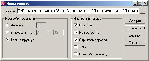 Эта программа предназначена для изучающих иностранные языки. Иностранник поможет вам запомнить иностранные слова и переводы к ним. Набор слов и переводов вы задаёте самостоятельно (но на этой странице могут быть словари для Иностранника). Программа отображает информацию во встроенном окне Internet Explorer, а потому: