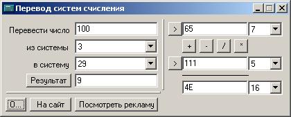 Эта программа предназначена для перевода чисел из одной системы счисления в другую. Поддерживаются основания от 2 до 36 (в качестве дополнительных знаков выступают латинские символы от A до Z). Программа "перевод систем счисления" умеет не только просто переводить числа из одной системы в другую, но и выполнять несложные арифметические операции с числами в разных системах счисления: складывать, умножать, делить и вычитать. Однако программа корректно работает только с натуральными числами, т.е. целыми положительными. Дробные и отрицательные числа пока некорректно обрабатываются. Справка по работе с программой находится в архиве. Версия 1.1, выход: 23.06.2009 (43,5 Кб) |