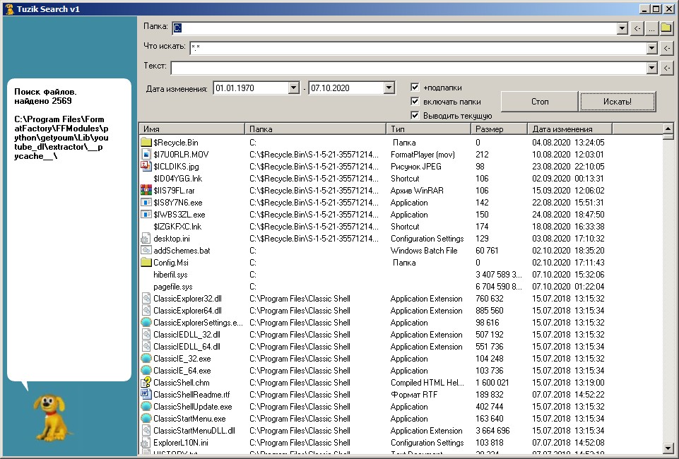 Программа для поиска файлов и папок на компьютере, стилизованная под поиск Windows XP. Поиск в Windows 10 напоминает MS-DOS, где всё нужно вводить через командную строку: дату изменения файла, текст для поиска в нём и т.д. Тузик решает эту проблему: для каждого параметра поиска - своё поле. Кроме того, многие просто соскучились по старому доброму псу из своего детства - ну что ж, вот, он возвращается! Но не ждите, что программа будет полностью имитировать привычный поиск XP, всё-таки воплощать все элементы мне показалось излишним, хотя основная картина соответствует духу того времени. Да и Тузик представлен не технологией MSAgent, а обычным видеофайлом, и трюки реализуются простым переходом на заданную позицию времени. А за видеоряд отдельное спасибо Mr.Showtime. Итак, что может Тузик, помимо выполнения трюков? Он может искать файлы и папки в разных местах по заданной маске имени/расширения, а также тексту в файлах. Не во всех файлах Тузик ищет текст - только в расширениях, указанных в файле настроек. Кодировки для поиска - UTF-8 и ASCII. Введённые параметры поиска запоминаются также в файле настроек. Поиск можно ограничить по дате изменения файлов, можно выключить/исключить подпапки, доступна сортировка столбцов. Тузика можно запускать прямо из текущей открытой папки, так что вызов поиска не будет ничем отличаться от вызова стандартного поиска Windows. Для этого выведите ярлык программы на рабочий стол и в свойствах ярлыка задайте горячие клавиши для запуска (например, Ctrl+F3), а в программе отметьте "Выводить текущую", и тогда при нажатии этих клавших Тузик запустится с уже установленной папкой для поиска. И последнее. Если вам надоело постоянное гавканье собаки, щёлкните на ней правой кнопкой мыши. Версия 1, выход: 04.10.2020 (1,78 МБ) Версия 1.1, выход: 02.01.2025 (1,79 МБ) |
